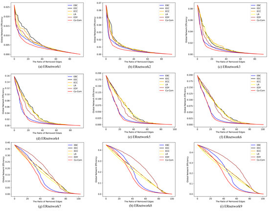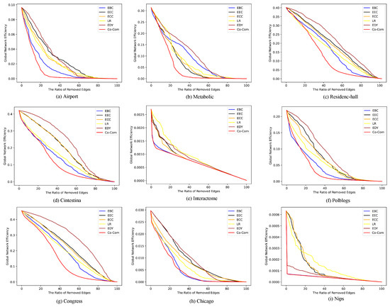 Figure 8 shows the change in GNE and Table 9 shows the area under the GNE curve (underline means the smallest, m is the number of edges, and are the parameters of Co-Com Centrality), indicating that removing edges with Co-Com Centrality can reduce GNE faster. To some extent, this shows the generality of Co-Com Centrality for networks with different densities.