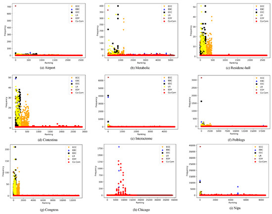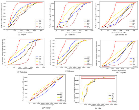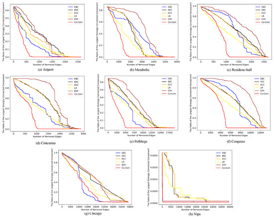 The reason why Co-Com Centrality performs well lies in the symmetric matrices and . For directed edge , can capture the influence of edges pointing to u and edges pointing from v on , and can capture the influence of edges pointing to v and edges pointing from u on . For EEC, its definition uses the edge adjacency matrix, which makes only capture the influence of the edges that point from v, but it cannot capture the influence of the edges that point to u and the influence of the edges that point from u. The definition of EDY uses the adjacency matrix, which has similar problems. ECC measures the edge importance by the sum of the shortest paths to other edges; for the directed network, considering the direction, it can only identify the important edges that point to a large number of edges, but cannot identify the important edges that are pointed to by a large number of edges. EBC lacks special consideration of the topology structure of the directed networks; it only considers the shortest path and ignores the influence of other paths (except for the shortest path) on the edge importance. LinkRank is a PageRank-based method. For edge , it can be understood as the PageRank importance of u multiplied by the random walk probability from u to v; the disadvantage of the method is that cannot capture the influence of the edges that point from v.