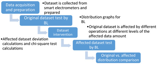 The analysis for data from smart electric meters provides some references, but we found analysis using Benford’s Law only rarely [1]. There are few references focusing on conformity tests for BL-based methods [2,3,4] and there are also references regarding the application of Benford’s Law in general for other science fields [5,6,7]. However, as of our current knowledge, there are no references dealing with the method’s sensitivity threshold changes when changing the original dataset in a non-natural way using Benford’s Law with different affecting operations.