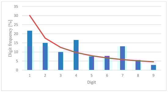 In [1], the authors focus on how Benford’s Law can be applied to datasets measured in electric energy systems. Other case studies are described in [8,9,10,11,12]. In [13], the authors collected electricity consumption data with Benford’s Law applied to the collected dataset [8,9,10,11,14].