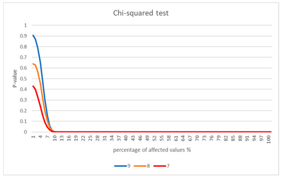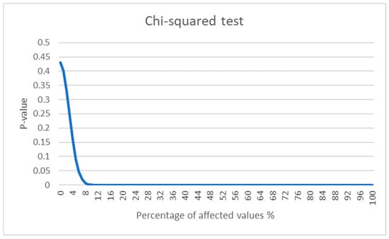 In both graph areas, with lower and higher affected data percentages, the progress follows a common path very closely. In addition, the breakpoint area where we can observe the Chi-squared test significance level intersection with the x-axis remains stable and does not change with different datasets and different replacement values. Thus, we can assume that the threshold level of method effectiveness for this dataset remains stable across different datasets and different replacement values.
