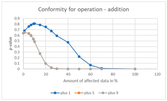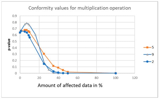 In Figure 7, the conformity value progress is shown for the multiplication operation. In this case, for all three affecting values, the sensitivity threshold can be determined at approximately 35% of the affected data amount and the graph progress follows roughly the same path. We can see again that the same effect as in Figure 4, the progress of the graph for affecting value 9 behaves in a strange way at first sight. First, the graph increases from its initial value until approximately 10%, and then it decreases according to the theory. This again can be explained as mentioned above.