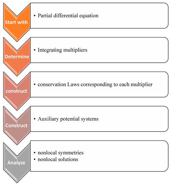 Bluman and Kumei [26] developed a methodology for detecting a nonlocal associated potential system when at least one equation within a system of partial differential equations (PDEs) is formulated in a conserved form. The equation in its conserved form provides a logical starting point for identifying auxiliary potential variables and establishing an auxiliary system of PDEs, commonly referred to as the potential system [27,28]. Nonlocal-associated systems are of significant importance in generating solutions for the given system of PDEs. These PDEs arise through symmetry reductions that can be attributed to nonlocal symmetries [29,30,31], as opposed to invariant solutions obtained from point symmetries. The methods utilized in this study can be concisely summarized as follows:
