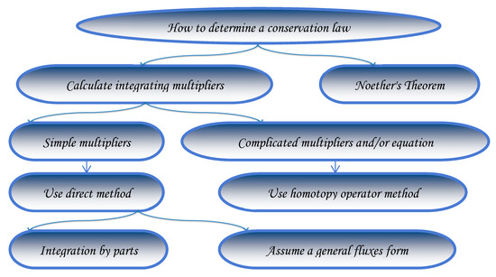 The direct method is a systematic method used to construct local conservation laws, as proposed [32,33,34]. According to this method, one seeks a set of local multipliers of a given PDE system, which depend on independent and dependent variables and derivatives of dependent variables up to some fixed order.
