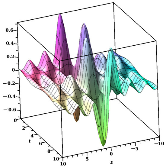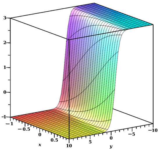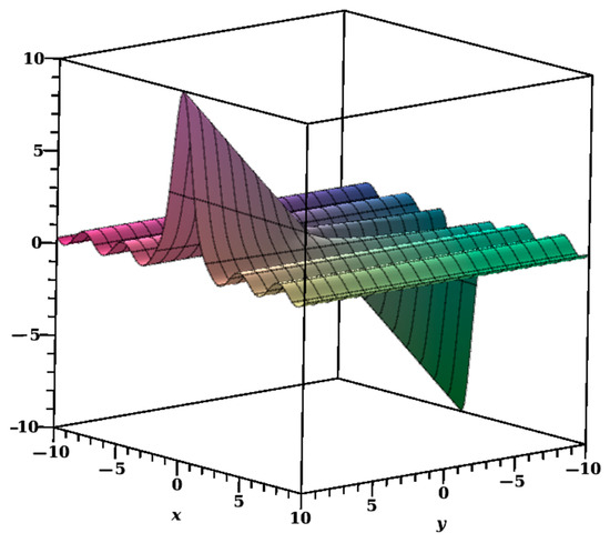 Some interesting waveforms are depicted in Figure 3, Figure 4, Figure 5 and Figure 6. Figure 3 is a kink soliton solution, possibly derived from the YTSF equation. It is a stable localized transition region between two different constant states or vacuum levels in a system. Physically, such solutions can be used to describe phenomena such as domain walls between two different magnetic or electric regions, phase boundaries in materials, or the propagation of sharp fronts in nonlinear media. In engineering, information on these kink solutions is valuable due to their use in nonlinear optics for signal processing, data transmission by optical fibers, and materials science defect or interface modeling. Figure 4 presents a more complex wave solution that is different from the elementary kink. It shows a localized central excitation with tails of decaying oscillations, a representation of a breather soliton or a localized wave packet. This could physically represent a pulsating localized excitation, a temporary concentration of energy within a nonlinear system, or the interaction dynamics of multiple wave components. These intricate wave structures are explored in engineering contexts, such as nonlinear fiber optics for high-level signal modulation, rogue wave analysis in fluid dynamics, or the simulation of energy localization phenomena in plasma physics. Figure 5 displays some localized wave patterns interacting with each other, perhaps breathers or solitons, forming with space and time. Physically, this could be the collision, interaction, or fusion/fission process of nonlinear waves, displaying events such as energy transfer or the creation of complex, transient patterns in the system. Engineering applications of the research on such complex dynamics include modeling multi-pulse interactions in optical communication systems to wave turbulence in plasma or fluids. Figure 6 depicts a solution characterized by a broad parabolic profile modulated by fine periodic ripples. It describes a situation in which a quadratic-varying background potential or field in one direction () exists with stable, periodic wave patterns in the orthogonal direction (). At a physical level, this might describe situations such as wave propagation or pattern formation in a confining potential, or periodic instabilities arising on a slowly varying background field. Engineering applications range from the design of periodically appearing graded-index waveguides to pattern analysis in space-inhomogeneous condensed matter systems or wave propagation in bounded fluids or plasmas.