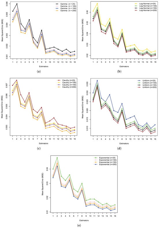 Figure 1. A graphical display of the findings utilizing information obtained from different population distributions. In the figure, the vertical axis represents the mean squared errors (MSEs) of the estimators, while the horizontal axis denotes the corresponding estimators. To enhance clarity, each estimator is assigned a numerical label from 1 to 16. For further details, please refer to Table 3, Table 4, Table 5 and Table 6. (a) X∼ with . (b) X∼ with . (c) X∼ with . (d) X∼ with . (e) X∼ with .