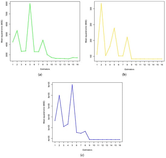 Figure 2. A graphical display of the findings utilizing information obtained from different datasets. In the figures, the vertical axis represents the mean squared errors (MSEs) of the estimators, while the horizontal axis denotes the corresponding estimators. To enhance clarity, each estimator is assigned a numerical label from 1 to 16. For further details, please refer to Table 2. (a) Source: [13]. (b) Source: [32]. (c) Source: [33]. - The box plot given in Figure 3 illustrates the distribution of mean squared error (MSE) values for different sample sizes (25, 100, 150, and 200) across five distributions: Gamma, Lognormal, Cauchy, Uniform, and Exponential. As sample size increases, the MSE values tend to decrease, indicating improved estimation accuracy with larger samples. The plot also highlights variability in MSE across the different distributions, with some showing wider spreads and others demonstrating more consistent performance.