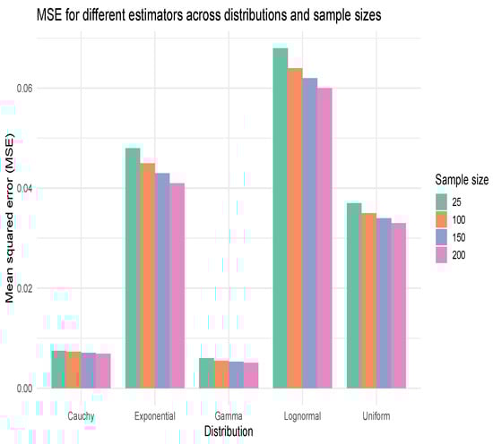 Figure 3. A graphical display of the findings utilizing information obtained from different datasets. In the figures, the vertical axis represents the mean squared errors (MSEs) of the estimators, while the horizontal axis denotes the corresponding distributions and sample sizes. - The bar chart displayed in Figure 4 shows MSE values for different estimators across five distributions and four sample sizes. MSE generally decreases with larger sample sizes, indicating better estimator performance. Distributions like Lognormal and Exponential show higher MSEs, suggesting more estimation difficulty compared to Gamma and Uniform.