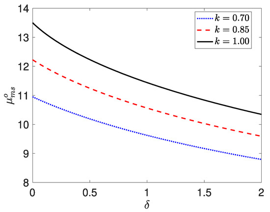 We will next conduct a numerical simulation analysis to specifically model the impact of customer bounded rationality on service providers’ decisions and profits. Building on the research structure and simulation approach of Zhan et al. [2] and Li et al. [25], we will create a dataset that satisfies the conditions of the theoretical model for the simulation analysis. For our study, the conditions of the theoretical model must meet the following requirements: , , , , and (where and are determined by the optimization results). Based on these conditions, we have designed the following dataset: , , , , , , and . Service providers can adjust the dataset according to their specific market research and operational needs, reflecting the generalizability and robustness of our study. In Figure 1, Figure 2 and Figure 3, we will analyze the influence of customer limited rationality on the optimal service rate , advertising level , and profit . In Figure 4, we will change the advertising cost coefficient from to to illustrate how profits vary with different values of .