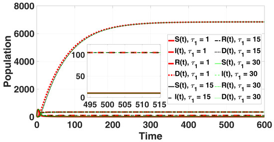 Here, , , with and Further, is described in detail in [33]. In the model equations, the deceased compartment D only accumulates individuals who die due to infection at a rate of . Naturally deceased individuals with a rate of d from the compartments , and R do not enter into D and are directly removed from the system. Furthermore, our model includes time delays, with a particular focus on the disease latent period represented by the parameter and the delay in treatment denoted by , where . The model parameters are defined in Table 1.