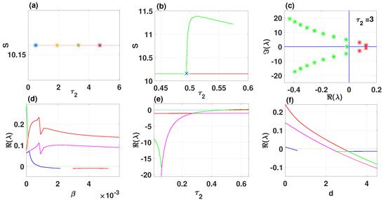 where Since f10 is strictly greater than zero, all the conditions (a)–(c) of Lemma 2.3 in [48] are not satisfied. Thus, all the roots of (A21) will have negative real parts, implying that the system is locally asymptotically stable for all and . Furthermore, we also confirm that conditions (a)–(c) do not hold for our chosen numerical values. □