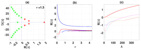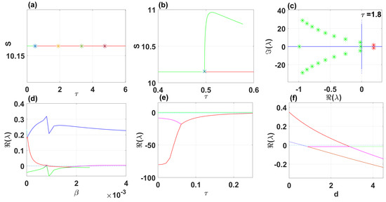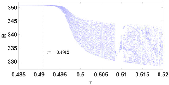 According to Rouché’s Theorem (see [50]), the root of the characteristic Equation (A27) crosses the imaginary axis from left to right as changes continuously from smaller than to greater than . Therefore, the transversality condition is fulfilled, and the conditions for Hopf bifurcation [51] are met at .