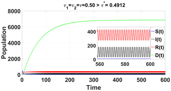Delay differential equations (DDEs) offer a more complex dynamic than ordinary differential equations, as the introduction of time delays can destabilize previously stable equilibria, leading to population fluctuations [18,19,20]. This makes the study of delays essential for understanding population dynamics, especially in the context of epidemics, where various infectious diseases exhibit different types of delays during their spread. A comprehensive overview of the relevance of DDEs in population dynamics and epidemics is given in [21]. Various scenarios with the inclusion of delays have been analyzed by researchers, including vaccination periods [22], asymptomatic carriage and infection periods [23], immunity periods, and incubation or latent periods [23,24,25,26]. In [27], the research focuses on an SEIRS model, specifically examining the impact of constant delays on both immune periods and the latent period, and [23] analyzes a model with delays in both asymptomatic carriage period and incubation. In addition, the authors of [28] examined the stability of periodic solutions within a delayed feedback control system and the existence of bifurcation.