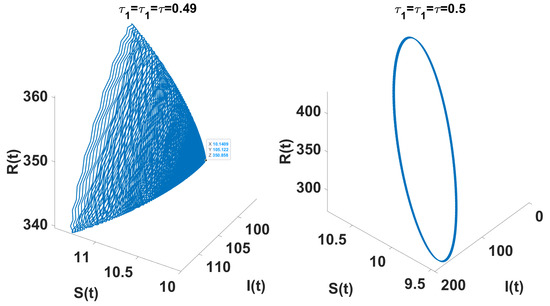 The inclusion of two time delays, (incubation period delay) and (treatment delay), is of biological and mathematical importance. The incubation delay captures the period between infection and contagion, which affects the early dynamics of the outbreak. The treatment delay represents the delay in medical intervention, which affects recovery rates and disease persistence. Mathematically, these delays act as bifurcation parameters, meaning that if they exceed certain critical thresholds, the system undergoes Hopf bifurcation, leading to persistent oscillations in the spread of the disease. This suggests that reducing treatment delays could be an effective strategy to prevent periodic outbreaks and control an epidemic more efficiently.
