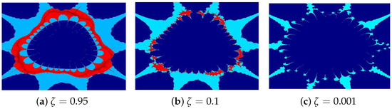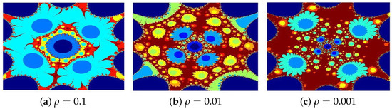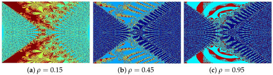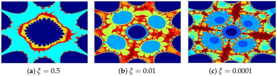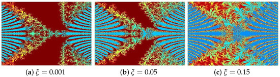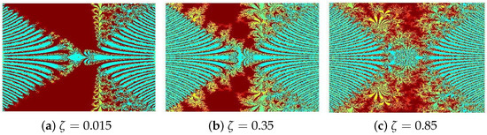 From Figure 11, Figure 12, Figure 13 and Figure 14a–c, for the fixed values and we observe the impact of varying one parameter from the set while keeping the other three constant. It is evident that these four parameters play a crucial role in shaping the structure of the Julia sets. Specifically, as the values of increase, notable changes occur in the size and form of the fractal bulbs. As illustrated in Figure 11, Figure 12, Figure 13 and Figure 14, the bulb size enlarges with increasing parameter values, accompanied by distinct transformations in shape and visual appearance.