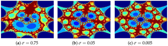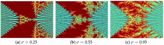 In Figure 1, Figure 2, Figure 3 and Figure 4a–c, for and we fix the values of three parameters from and vary the remaining one. It is clear that the four parameters and play a significant role in determining the shape, size, and color of the sets. As shown in these figures, an increase in any of the parameters leads to an expansion of the set, accompanied by changes in its shape. The image generation time for each iteration is also recorded.