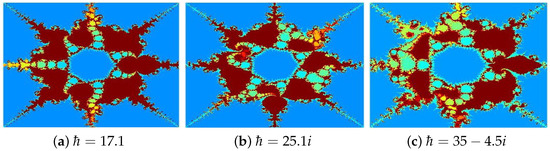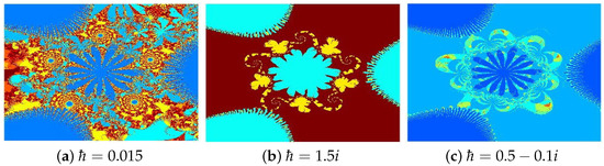 Figure 5. Julia sets generated via Algorithm 1 with fixed values of , , and varying ℏ. Image execution times are as follows: (a) 3.01 s, (b) 3.18 s, and (c) 3.32 s. - In Figure 6, with fixed, ℘ is varied as follows: (a) (b) (c)