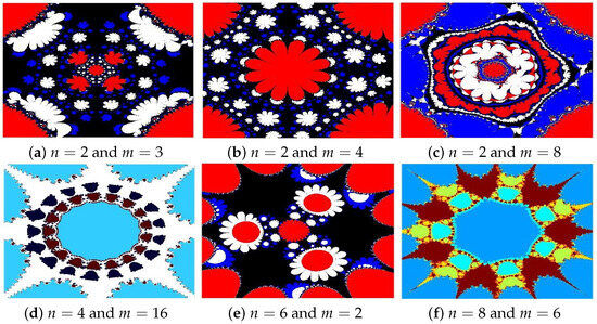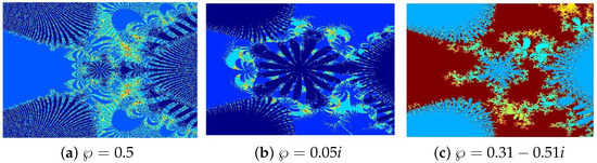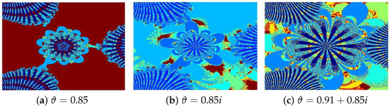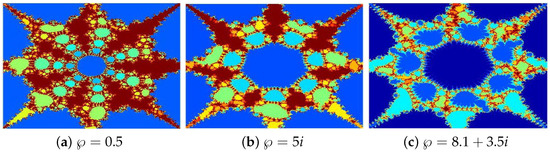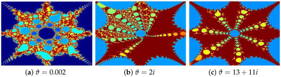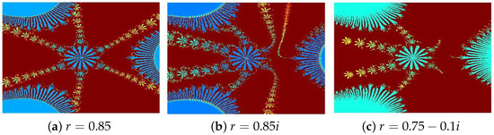 In this example, we demonstrate the diversity of Julia sets produced using the generalized viscosity approximation-type iterative method for The resulting sets are displayed in Figure 20a–f, generated using the following parameter values: