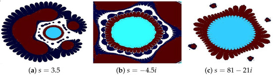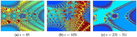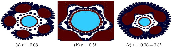 In Figure 18a–c and Figure 19a–c, Julia sets are displayed for varying parameter configurations: (a) where r, and s are fixed as purely real, (b) as purely imaginary, and (c) as complex values. The central circular region of the Julia sets undergoes noticeable changes, with the surrounding area also transforming in shape and size. These changes often lead to portions detaching from the central structure, forming new, smaller circular regions that bear a resemblance to the original central part.