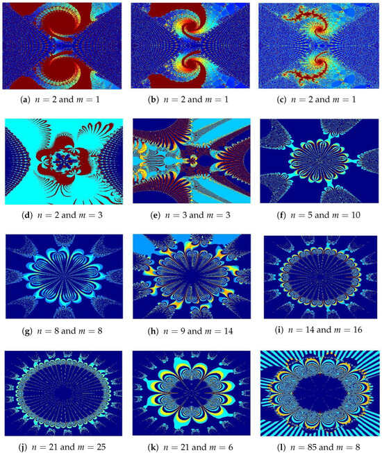 In Figure 10a–e, we observe distinct behavioral changes in the Julia sets when varying the parameters in the generalized exponential rational function via Algorithm 1. Adjusting the values of parameter and b as purely real, purely imaginary, and complex lead to noticeable differences in the color, shape, and size of the Julia sets. The resulting images display intricate and beautiful fractal patterns. Figure 10f–l illustrate Julia sets for even/odd, while the other parameters remain fixed as described in Figure 10f–l. From these images, it is clear that as n and m increase, and the sets evolve into circular shapes, with petal counts corresponding to the values of n and m. Furthermore, the number of petals increases as n and m increase. The generated Julia sets are strikingly complex, resembling traditional Rangoli patterns, floral shapes, or intricate glass art. Additionally, the image generation time is recorded, showing an increase with each iteration.