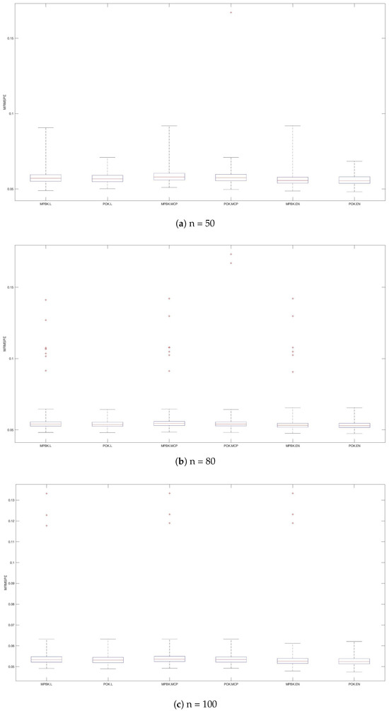 The simulation studies were carried using the POK and MPBK methods with the lasso, EN, and MCP as penalty functions. MPBK.MCP, MPBK.MCP, and MPBK.EN denote the MPBK method with the lasso, MCP, and EN, respectively, as penalty functions. Furthermore, POK.L, POK.MCP, and POK.EN denote the POK method with the lasso, MCP, and EN, respectively, as penalty functions. In the simulation study, 1000 sample points were randomly selected as testing data, and six methods are evaluated based on 500 simulations.