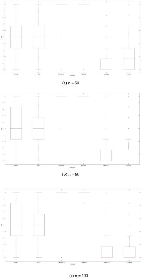The variable selection performances of the six methods are shown in Table 1 and Figure 1, Figure 2 and Figure 3. According to Table 1 and Figure 2, MPBK.L, MPBK.MCP, POK.L, POK.MCP, POK.Lm and POK.EN exhibit more pronounced overfitting tendencies than MPBK.EN and POK.EN, resulting in substantially higher MS and IEIR values. This indicates that MPBK.EN and POK.EN achieve better identification in variable selection.