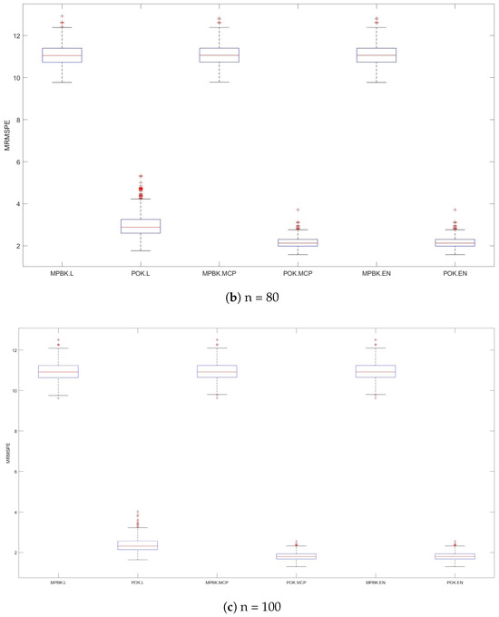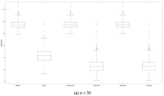 The variable selection performances of six methods are shown in Table 2 and Figure 3. Table 2 demonstrates that POK.L exhibits larger MRMSEPs than POK.MCP and POK.EN, while the latter two methods behave similarly, perhaps due to the strong compression effect of the lasso penalty, and all three POK methods demonstrate significantly smaller MRMSEP values than their MPBK counterparts. Figure 3 provides further evidence of this phenomenon, demonstrating POK.MCP and POK.EN’s consistent superiority in prediction accuracy across diverse parameter configurations.