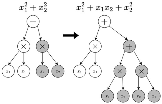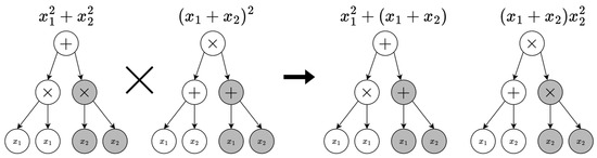 where and are two parent individuals chosen via selection, and is the predefined crossover probability. With probability , a random node is selected in the tree representations of both parents and . The corresponding subtrees are swapped, generating two offspring that inherit genetic material from both parents, introducing new variations. If crossover is not performed (with probability ), the parent individuals are passed forward unchanged. Figure 1 illustrates the crossover operation, where shaded nodes are selected to be swapped between parents.