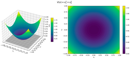 Numerous classical methods for identifying or approximating Lyapunov functions have been proposed, including the variable gradient method, Krasovskii’s method, and basis-function linearization; see [1,2,3,4,5,6] for a comprehensive overview. However, no universal technique exists, and constructing a Lyapunov function is generally as difficult as solving the system itself. In recent decades, advances in computational power have spurred research into numerical approaches such as sum-of-squares polynomials [7,8], piecewise affine functions [9], formal synthesis via satisfiability modulo theories (SMT) [10], and deep neural networks [11]. An in-depth survey of these methods can be found in [12], and studies on the stability of evolutionary systems are presented in [13,14].