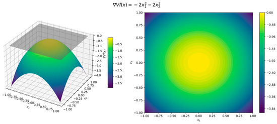 Figure 8 presents the surface and contour plots of the Lyapunov function (14), highlighting its quadratic form, where the level sets form concentric ellipses centered at the origin. The corresponding orbital derivative (15), shown in Figure 9, confirms strict negativity across all directions. Additionally, Figure 10, Figure 11 and Figure 12 present the surface and contour plots of the errors , visually confirming that the exponential stability conditions of the origin are met.