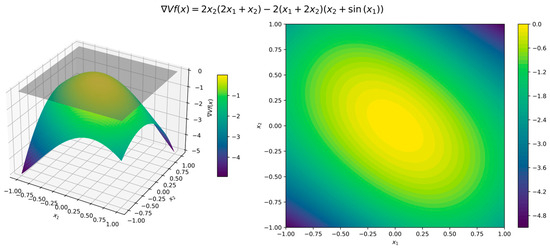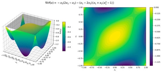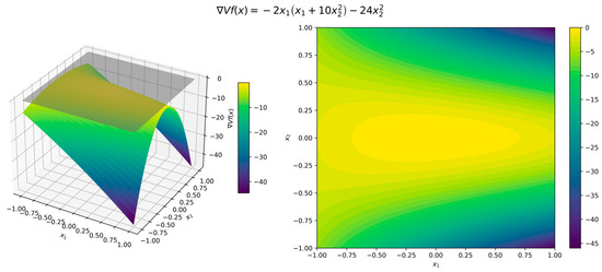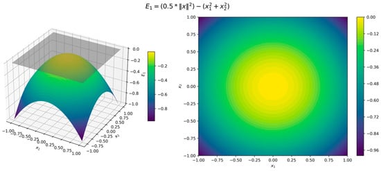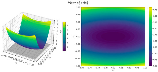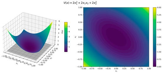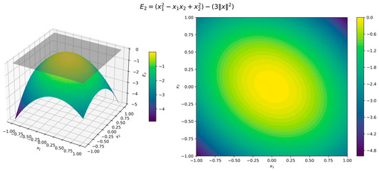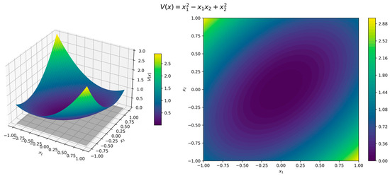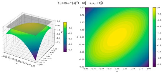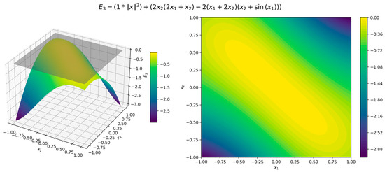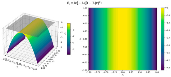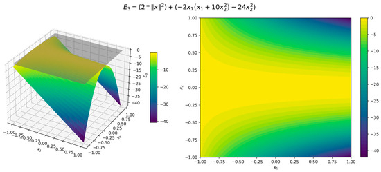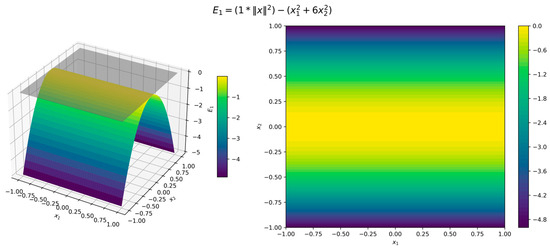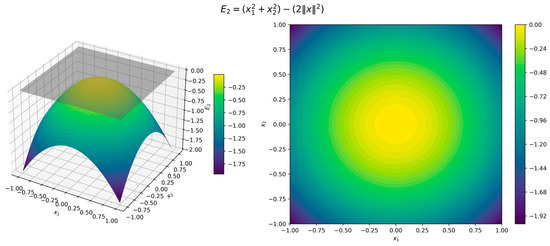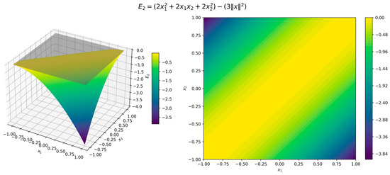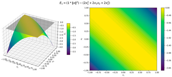 Figure 13 shows the surface and contour plots of function (17), visually confirming its properties. Figure 14 shows that the orbital derivative is negative over the considered domain. Figure 15, Figure 16 and Figure 17 display the surface and contour plots of the error functions , and , providing additional insight into the effectiveness of (17) in capturing the stability characteristics of the polynomial system (16).