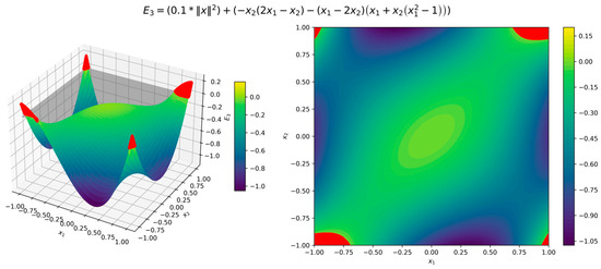 Figure 18 shows the surface and contour plots of function (20), visually confirming its properties. Figure 19 depicts the orbital derivative, revealing the intricate nonlinear dynamics of the system. Figure 20, Figure 21 and Figure 22 display the surface and contour plots of the error functions , offering further insight into the accuracy with which function (20) represents the stability properties of the Van der Pol system (19). The red region in Figure 22 indicates areas where , meaning the dissipation conditions are not met. However, this region falls outside the domain