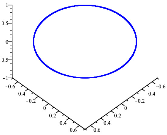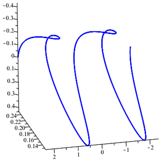 The curvatures and are computed as which gives Then, we have . This results in or By choosing , and we obtain i.e., σ and ρ are constants. Then, the curve given by the parametric form is a slant helix in M (Figure 1). If we choose , and it follows that , meaning that both σ and ρ are constants. Consequently, the curve given by the parametrization is a slant helix in M (Figure 2). Both curves and are also Darboux helices in M and they satisfy the differential Equations (20), (24) and (28).