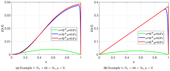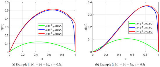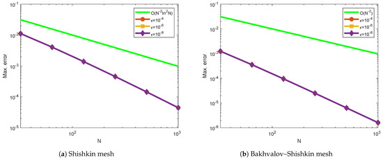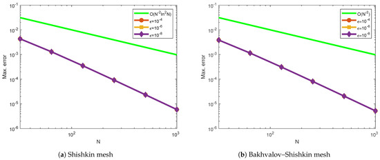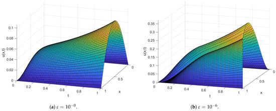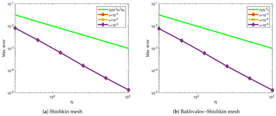 Table 1 and Table 2 indicate the generated maximum point-wise errors and uniform errors for Examples 1 and 2, respectively. Table 3 and Table 4 demonstrate the comparison of maximum point-wise errors and rates of convergence using the present method and other methods in the literature. Figure 1 and Figure 2 display the numerical simulations for Examples 1 and 2. The maximum point-wise errors for Examples 3 and 4 are provided in Table 5 and Table 6 to investigate the effect of small negative shifts on numerical solutions and the feasibility of the present method. Table 7 and Table 8 show the comparison of maximum point-wise errors and convergence rates for Examples 3 and 4. Figure 3 and Figure 4 depict the numerical simulations for Examples 3 and 4, respectively. Figure 1, Figure 2, Figure 3 and Figure 4 show the formation of a strong boundary layer near as . Figure 5, Figure 6, Figure 7 and Figure 8 exhibit the log–log scale plots of the maximum errors for each Example. The log–log plots suggest the theoretical (green-colored) and numerical (the other colors) errors. These log–log plots suggest the uniform convergence of the method. For values equal to , and , the maximum point-wise errors are almost the same. This causes overlapping in the log–log plot. Due to this reason, we observe a single curve for numerical results (purple-colored overlapped numerical results for , and ) and a single curve for theoretical results as stated in Theorem 6 (red-colored). Due to this overlapping, we have only two curves (line graphs) in all log–log plots. Figure 9 depicts the effect of the perturbation parameter and small negative shifts via line graphs for Examples 1 and 2, while Figure 10 shows the effect of the perturbation parameter through line graphs for Examples 3 and 4, respectively. As the perturbation parameter size decreases, the layer thickness increases. Since we have not calculated the maximum errors for in all Tables, we have not included the rate of convergence () in the last rows. This is because of the low precision in our computer memory. When the number of mesh points increases, our computer becomes busy.