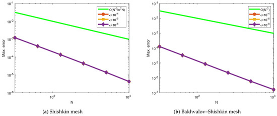Log–log plot of the maximum point-wise errors using for Example 2.