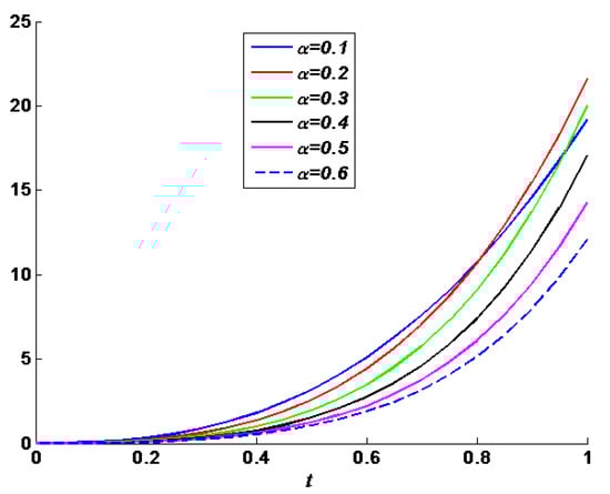 In Figure 1 and Figure 2, we present the solutions obtained for some values of α. The solutions obtained follow two stages. The first occurs when alpha varies between 0.1 and 0.2; then, the values of the solutions increase when alpha increases. The solution reaches maximum values when alpha is close to 0.2. Second, if α exceeds the value 0.2, we notice that if the alpha increases, then the maximum solution decreases.