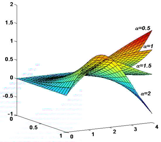 In Figure 3, we present the solutions obtained for some values of α. The solutions obtained when alpha varies between 0.25 and 1; then, the values of the solutions increase when alpha increases. The solution reaches maximum values when alpha is close to 1.