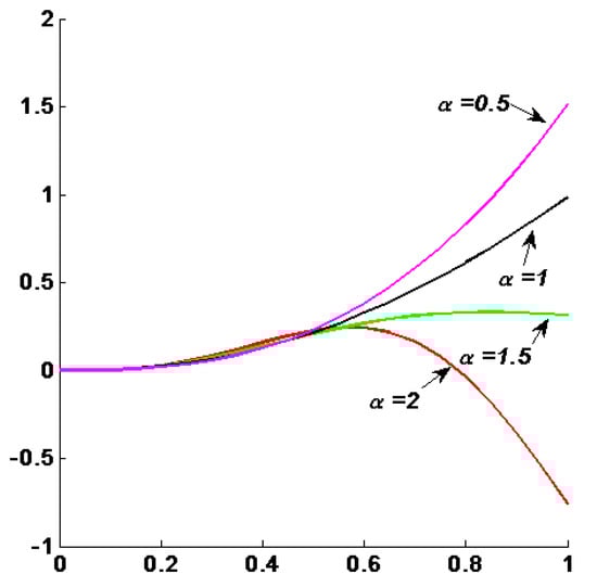 The solutions of examples 4 and 5 are represented in Figure 4 and Figure 5, according to alpha = 0.5, 1, 1.5, and 2. We notice that the branches of each solution on the interval [0, 0.5] and for these values of alpha chosen are almost equal. Then, they begin to remarkably change their gaits from point 0.5 (Figure 5).