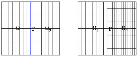 We introduce partition of . Let be two families of conforming, quasi-uniform, and regular rectangles of the subdomains (), respectively. For any , we define . Let . Then, for . Note that any element is considered closed. Obviously, forms a rectangles of the whole domain . Here, we allow the mesh sizes and to be quite different in this paper; then, may have many hanging nodes on the interface . Clearly, each partition induces a partition, denoted by of the interface , as follows: