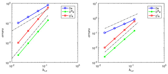 Note that is the harmonic average of and . Remark that we obtain a quasi-uniform mesh and piecewise mesh by and , respectively. And for the case of a quasi-uniform mesh, the harmonic weights are used for discontinuous Galerkin (DG) methods in [31,32,33,34].