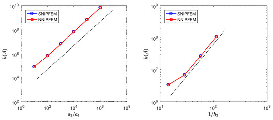 Finally, we provide two tests to report the condition number of the stiffness matrix. First, we fix the mesh size and test the influence of the ratio of the coefficients on the condition number. Left of Figure 4 shows the log–log plot of condition number versus with , , for SNIPFEM and NNIPFEM. It shows that the condition number depends on linearly, where and . Second, we fix and and change the value to test the influence of the mesh size on the condition number. Right of Figure 4 reports the log–log plot of condition number versus with for SNIPFEM and NNIPFEM. We observe that , where .
