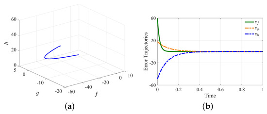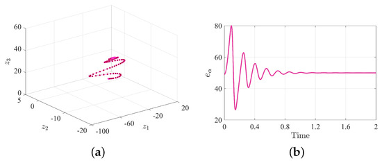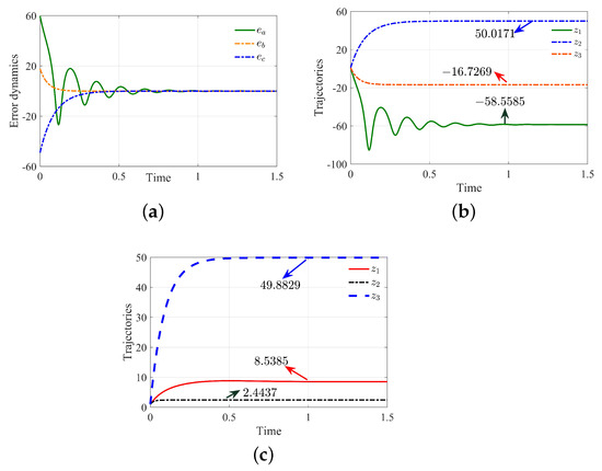 Figure 4a illustrates phase portraits with trajectories converging to equilibrium points and using an adaptive control technique. In contrast, in Figure 4b, the updated law/parameter estimation dynamics during the control process can be observed, which is also useful in system adjustments by tuning the parameters. The error dynamics in Figure 5a demonstrate the convergence to zero at and s for both equilibrium points, respectively. Furthermore, Figure 5b,c depict the time history of state variables, showing the systems’ stabilization with respect to time, especially toward the specified equilibrium points.