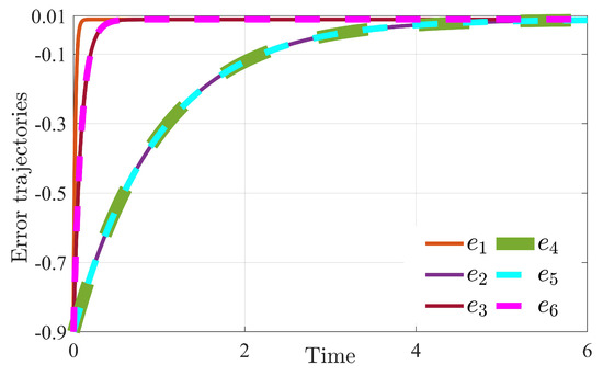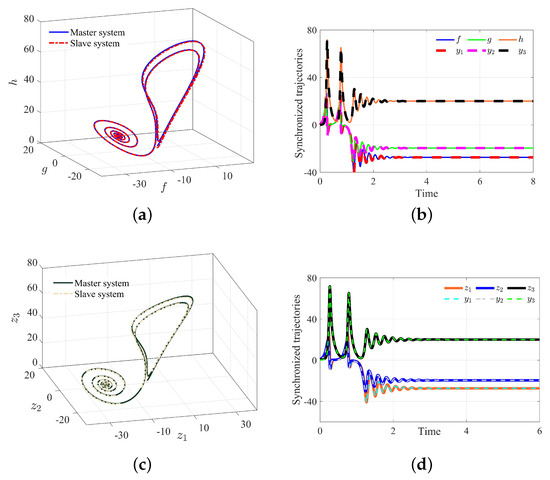 For , Equation (34) is negative definite, allowing for the application of the synchronization process.