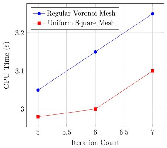 - Figure 9 illustrates the differences in computational efficiency between square and Voronoi meshes. The plot compares iteration count and CPU time, showing that a reduction in iterations leads to decreased computational cost, reflecting the solver’s efficiency across mesh types.