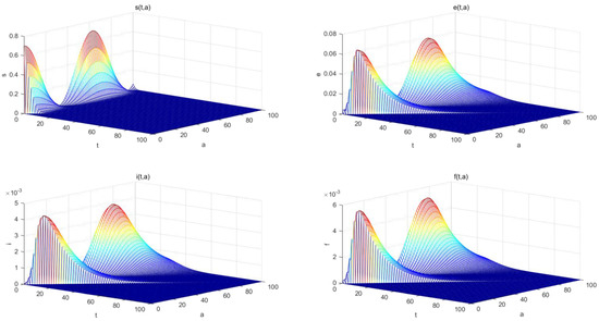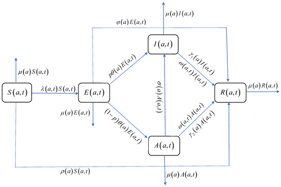 We assume that the population can be classified into five different groups, that is, susceptible, exposed, infectious, asymptomatic, and recovered, respectively. , , , , and represent the densities of susceptible, exposed, infectious, asymptomatic, and recovered individuals at time t with age a, respectively. The total population is denoted by and the maximum age of an individual by .