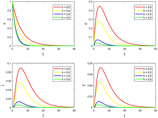 In this section, we validate the aforementioned conclusions via several numerical simulations. Because the spread of the disease can be influenced by the media, we discuss the impact of media broadcasting intensity on the disease. Some parameters are derived from reference [11], which are not only based on real data estimates but also possess biological significance. We assume that , , , , , , , , , , , , , and . From the following Figure 3, it can be seen that, under certain initial value conditions, as the intensity of media broadcasting increases, the number of exposed, infectious, and asymptomatic individuals decreases.