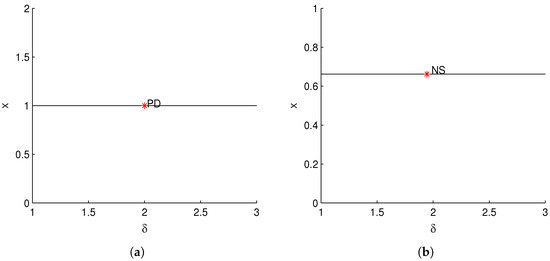 where . For system (12), there exists a pitchfork bifurcation curve leading to the emergence of two symmetrically coupled saddles. It is not difficult to obtain for . With analogous argument, we can obtain the nondegenerate Neimark–Sacker bifurcation condition .