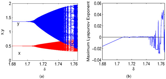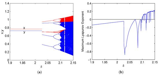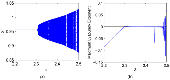 The unique fixed point is observed at when δ is swept through in map (3), with . Further calculations yield eigenvalues for the Jacobian matrix , along with . Theorem 2 confirms that system (3) undergoes a 1:2 resonance bifurcation at under these conditions.