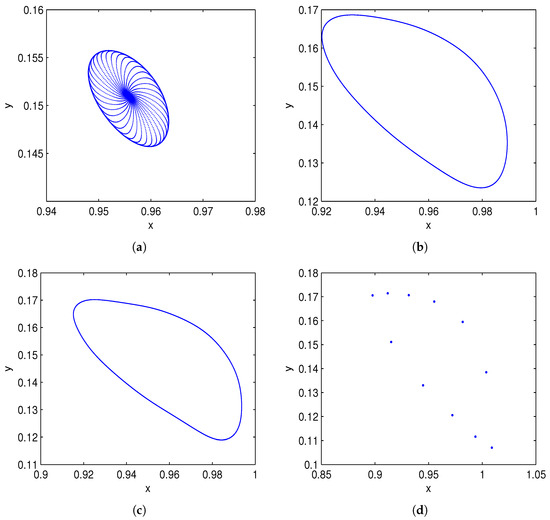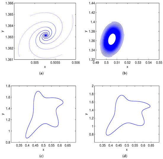 At last, we investigate the 1:4 resonance behavior in system (3) by randomly choosing the values from bifurcation set . By translating to the origin, we can express the model as a Taylor series expansion, which is similar to system (6). The corresponding Jacobian matrix at is calculated as below as