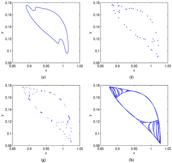 Figure 2 presents the codimension-two bifurcation diagrams exhibiting a prominent 1:2 resonance dynamics. Figure 2a illustrates the two-dimensional bifurcation diagram for map (3) in the plane at , with ranging from to , which is a neighborhood around . The robust Lyapunov exponent test in Figure 2b validates the presence of periodic orbits and chaotic behaviors. In Figure 2b, negative Lyapunov exponents reflect the existence of stable fixed points or periodic windows, whereas positive exponents highlight chaotic regions. The corresponding phase portraits are displayed in Figure 3 for different near . An invariant curve bifurcates from due to a Neimark–Sacker bifurcation at . After that point, quasi-periodic motion appears in the system, and chaotic motion finally occurs, as shown in Figure 3h.